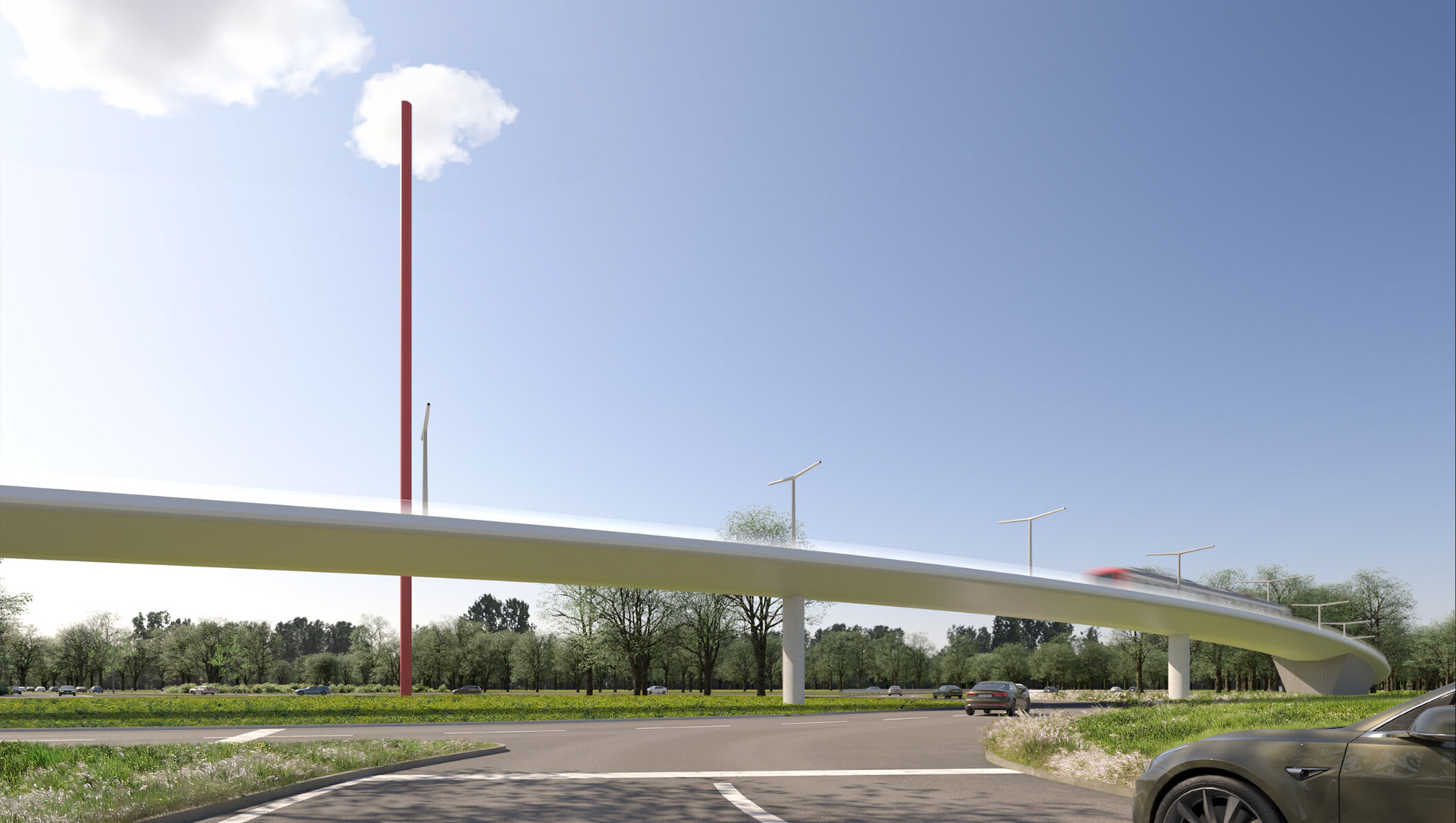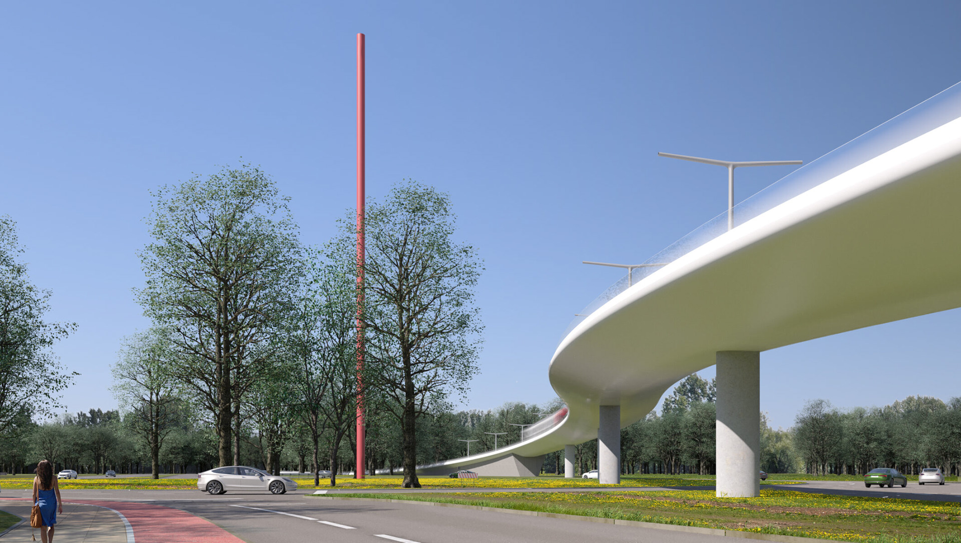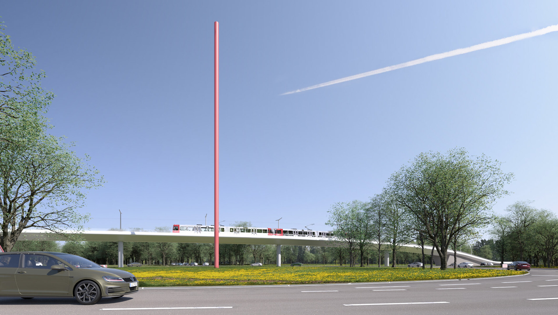 As part of Cologne’s sustainable urban development strategy, the city is extending the StadtBahn Süd tram line to connect the city centre with the southern districts of Rondorf and Meschenich. The route crosses the Arnoldshöhe roundabout, marking one end of Germany’s first Autobahn, the A555, which links Cologne and Bonn. Each end of the Autobahn is defined by the 50-meter red Standortmitte sculptures. The new tram bridge sweeps elegantly across the junction, integrating modern public transport infrastructure with the historic road network while carefully acknowledging and respecting the nearby cultural landmark.