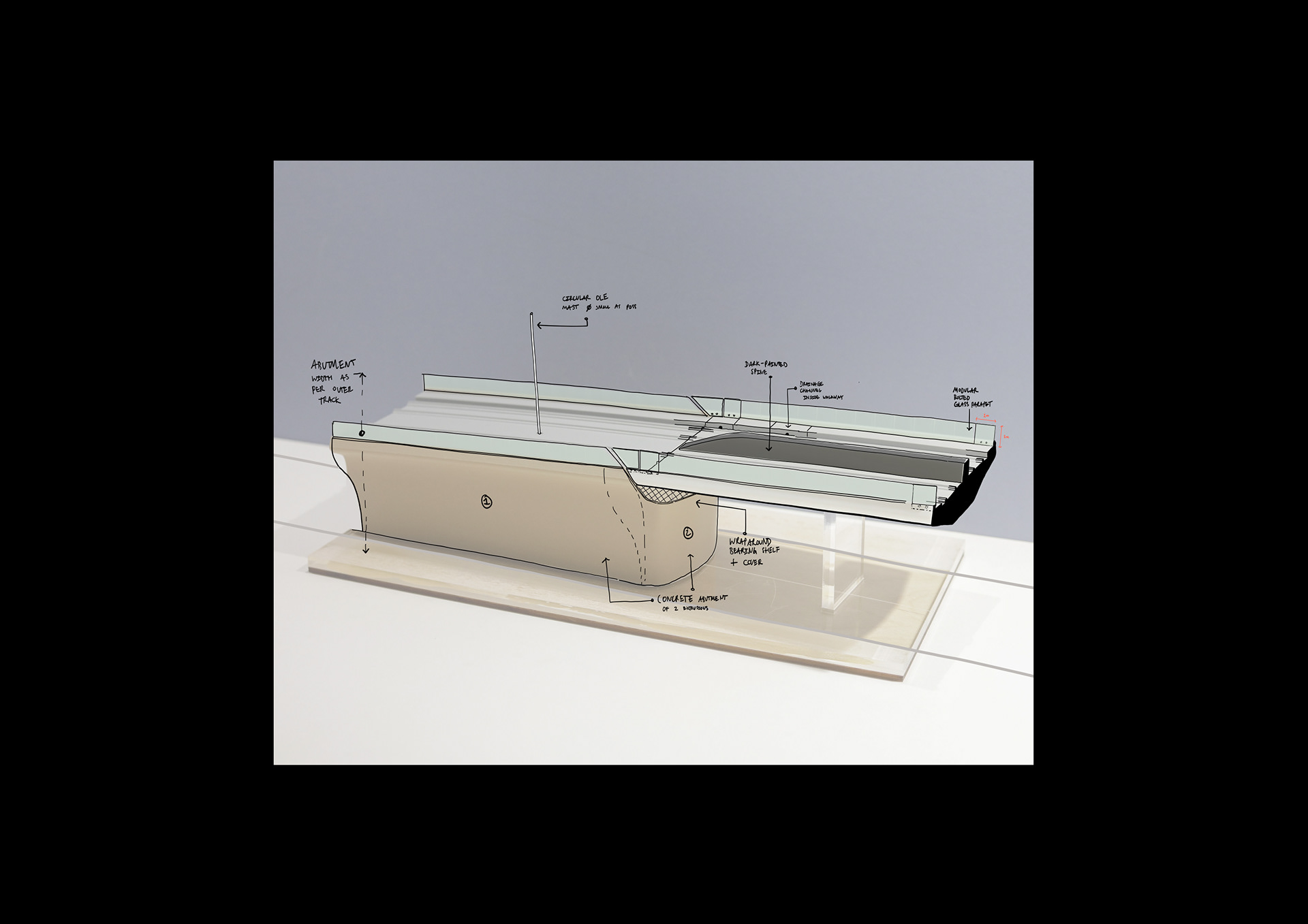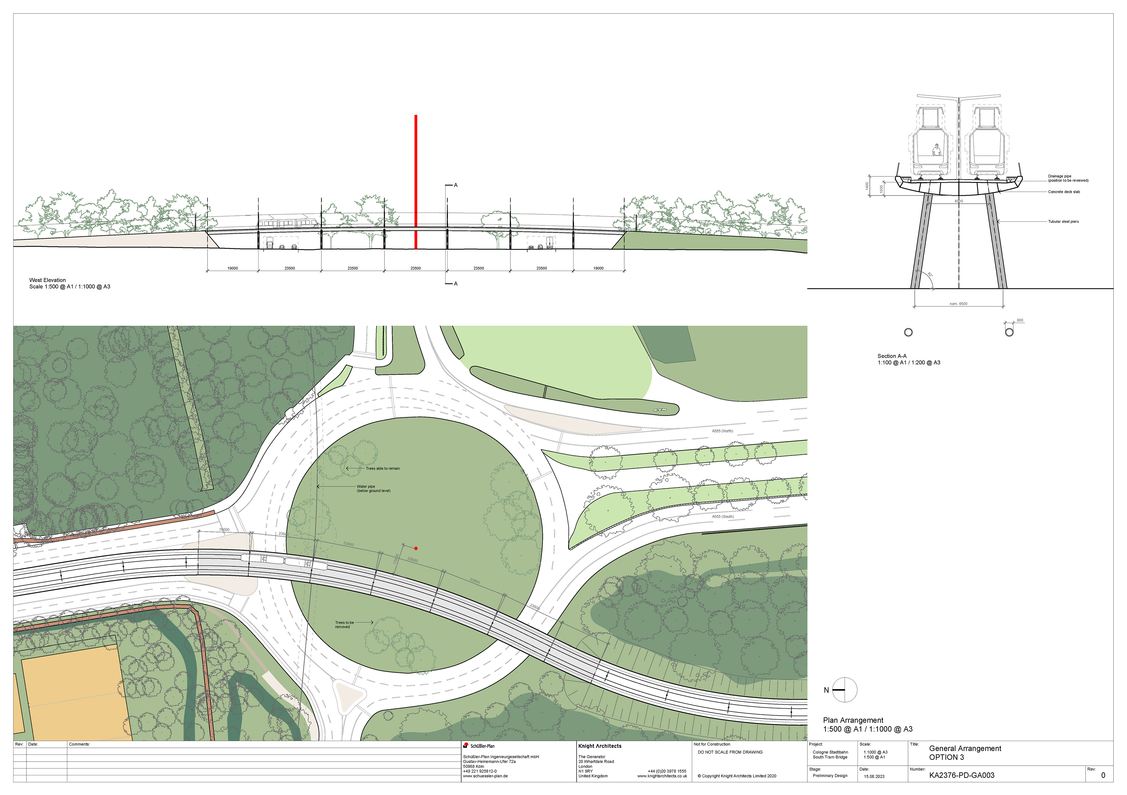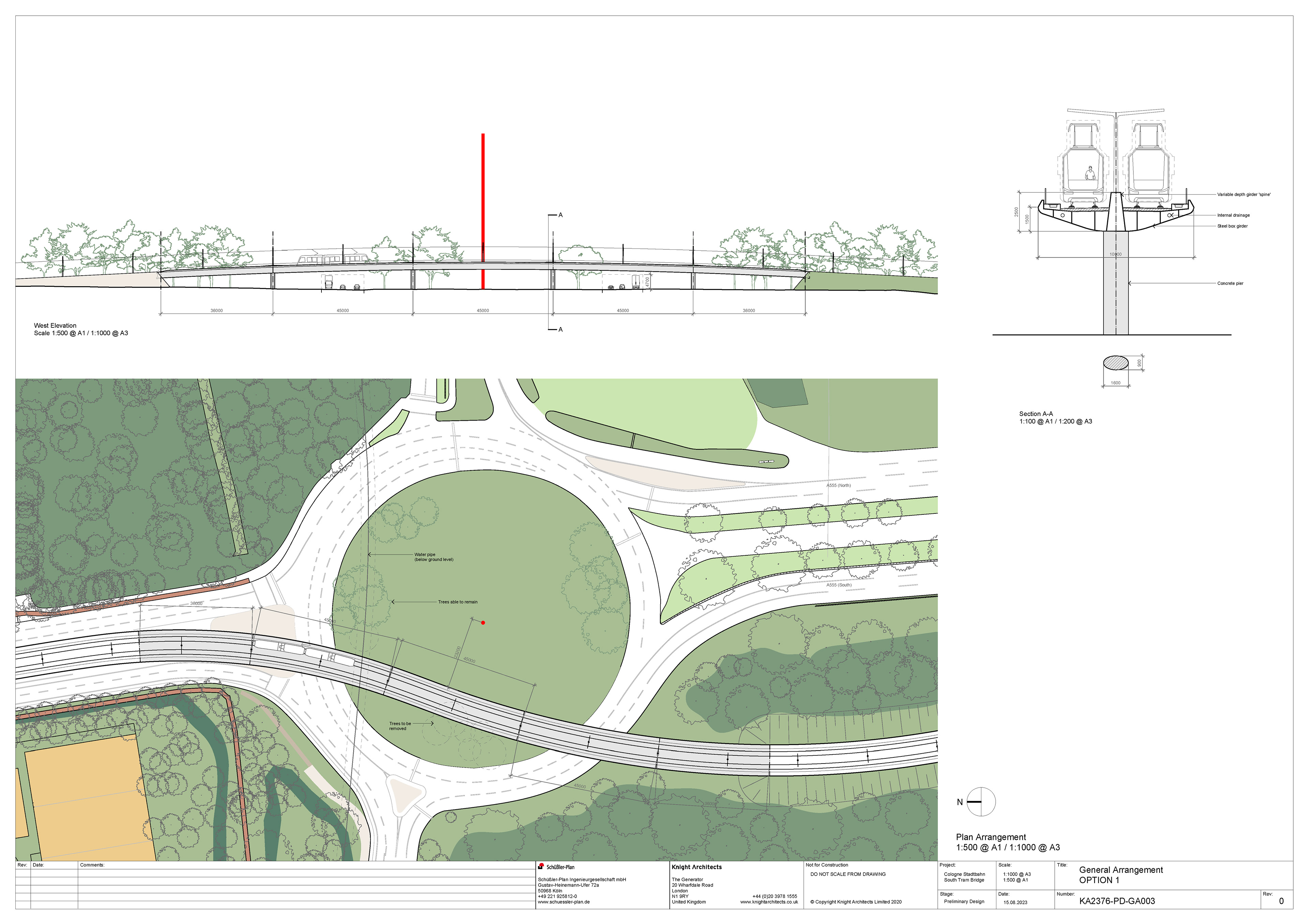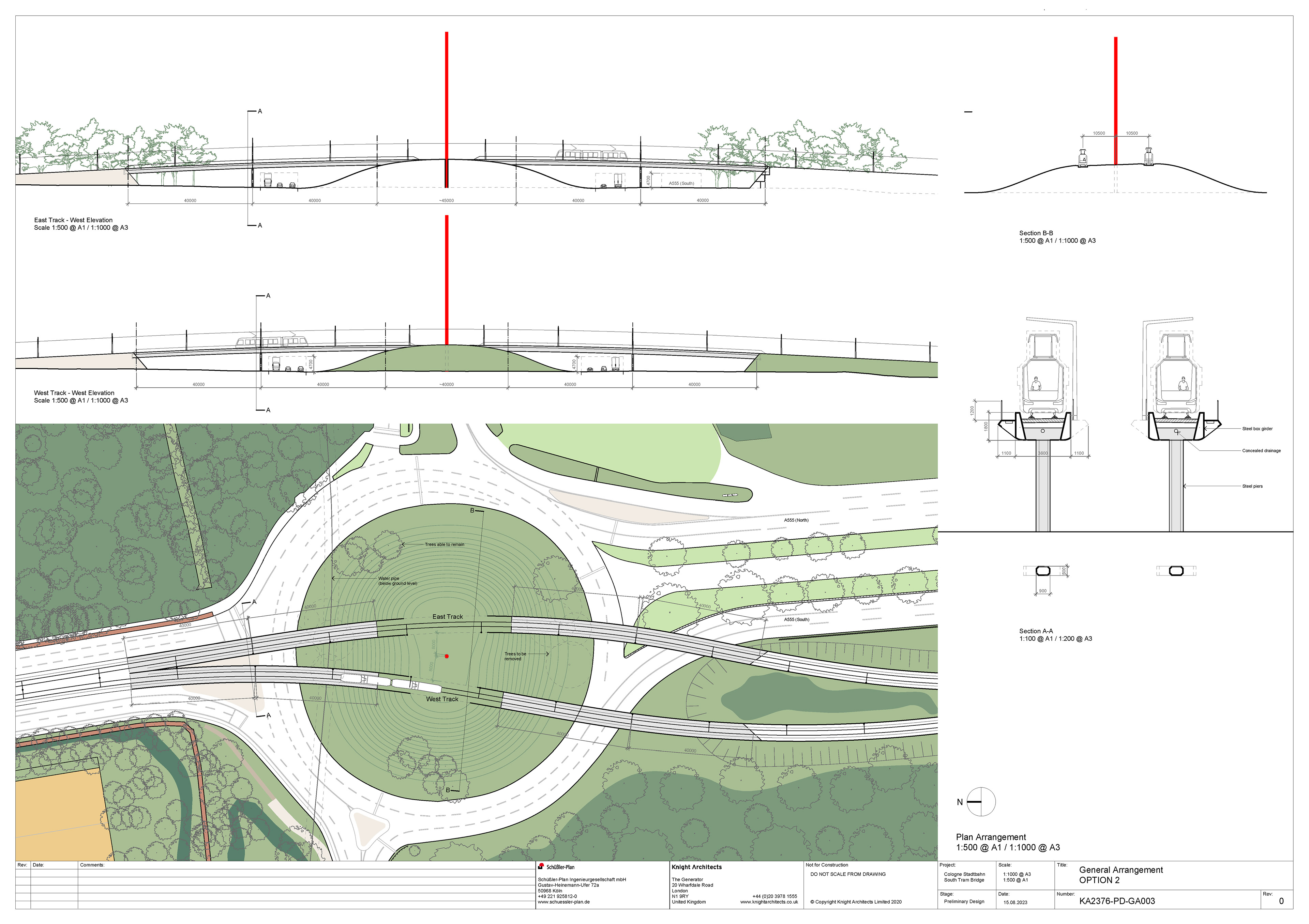 As part of Cologne’s sustainable urban development strategy, the city is extending the StadtBahn Süd tram line to connect the city centre with the southern districts of Rondorf and Meschenich. The route crosses the Arnoldshöhe roundabout, marking one end of Germany’s first Autobahn, the A555, which links Cologne and Bonn. Each end of the Autobahn is defined by the 50-meter red Standortmitte sculptures. The new tram bridge sweeps elegantly across the junction, integrating modern public transport infrastructure with the historic road network while carefully acknowledging and respecting the nearby cultural landmark.